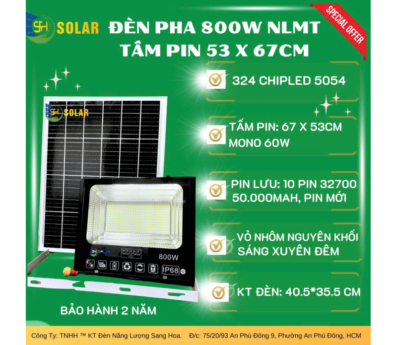 Đèn pha năng lượng mặt trời SH800W thương hiệu SH SOLAR là giải pháp chiếu sáng hiệu quả và tiết kiệm năng lượng cho môi trường, được thiết kế để cung cấp ánh sáng mạnh mẽ và đáng tin cậy trong mọi điều kiện ánh sáng. Với những tính năng nổi bật và ưu điểm vượt trội, sản phẩm này là sự lựa chọn lý tưởng cho các ứng dụng chiếu sáng trong công nghiệp, thương mại và dân dụng.