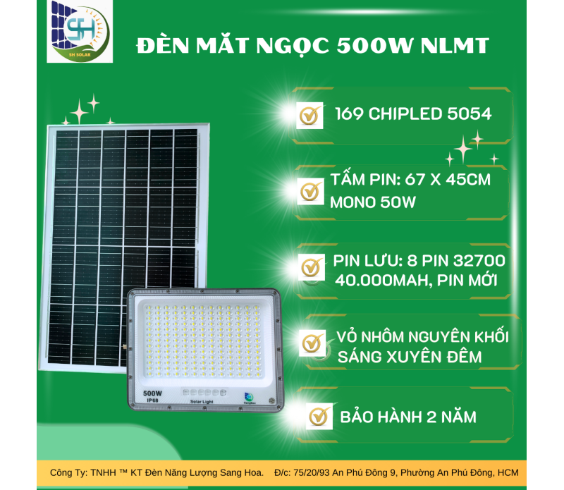 Đèn pha mắt ngọc chống chói năng lượng mặt trời 500W SH được trang bị các linh kiện cao cấp và cung cấp nguồn ánh sáng tốt. Cùng với ưu điểm tiết kiệm điện năng, thì Mắt Ngọc 500W đang dần là xu hướng chiếu sáng hiện nay. Mức sáng tốt giúp chúng có khả năng thay thế được đèn điện và có cường độ chiếu sáng vượt trội so với các loại đèn năng lượng mặt trời thông thường.