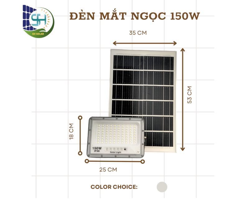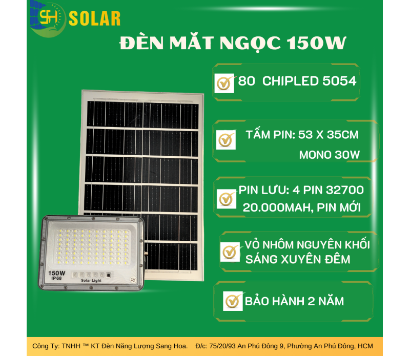 Đèn pha mắt ngọc năng lượng mặt trời SH 150W là một ví dụ điển hình về chất lượng và công nghệ vượt trội, đáp ứng một cách hiệu quả nhu cầu chiếu sáng cho các khu vực rộng lớn. Sản phẩm này gây ấn tượng với thiết kế độc đáo, đặc biệt hơn so với đa số đèn pha năng lượng mặt trời trên thị trường hiện nay. Với công suất lên đến 150W, đèn pha này cung cấp ánh sáng mạnh mẽ và đồng đều, tạo điều kiện lý tưởng cho việc chiếu sáng trong các khu vực đòi hỏi sự rõ ràng và liên tục của ánh sáng.